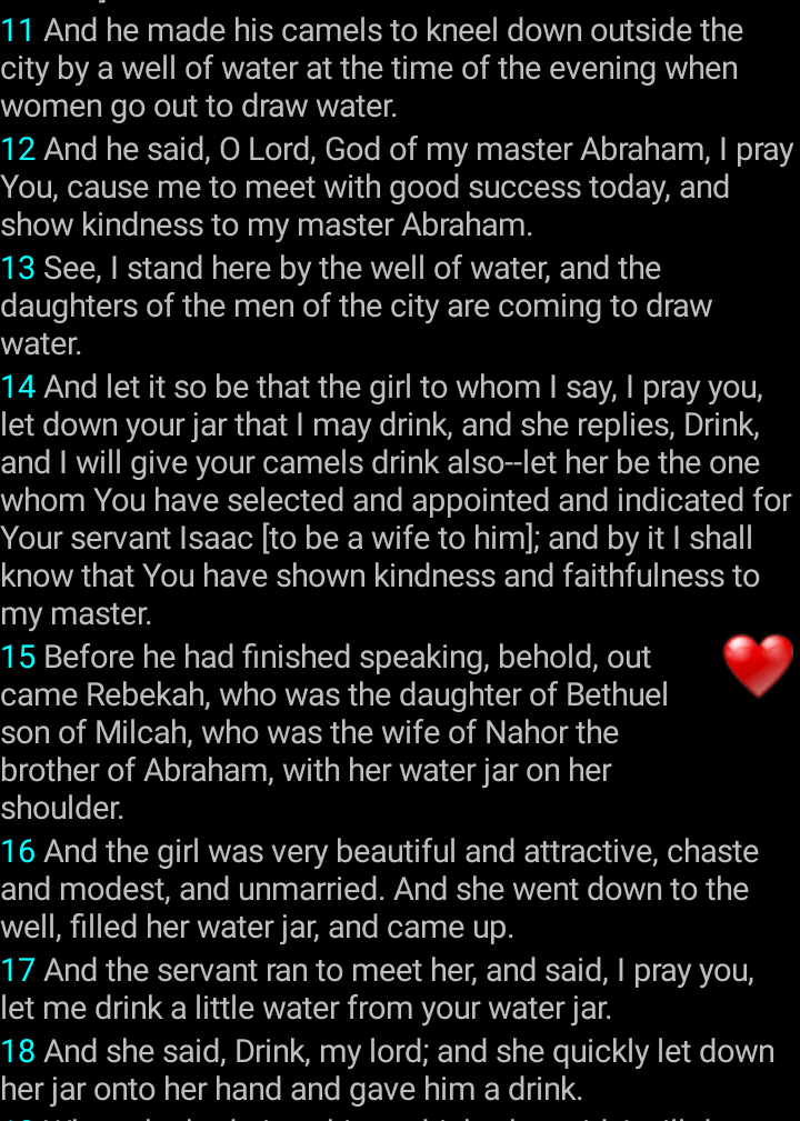 The story goes on. Eliezer had prayed that the lady he meets be the chosen one for Abraham’s son. That’s how it indeed ended. The bible says ‘I see the daughters of men coming to draw water…’