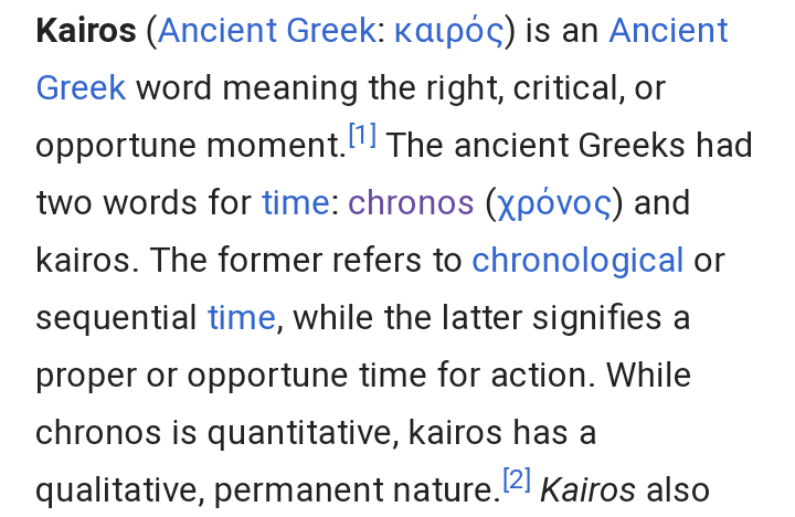 Kairos is endless (eternal), springing from the beginning of time to the end of time. For it, it can’t be sometime like chronos. It is anytime.