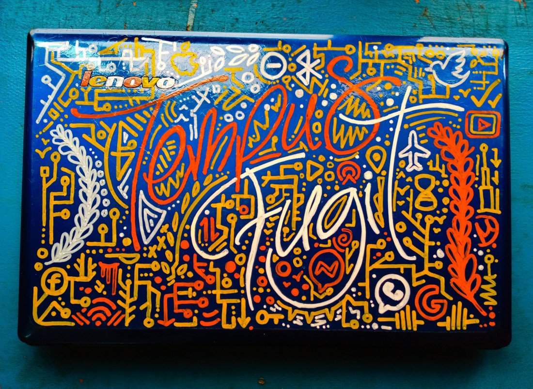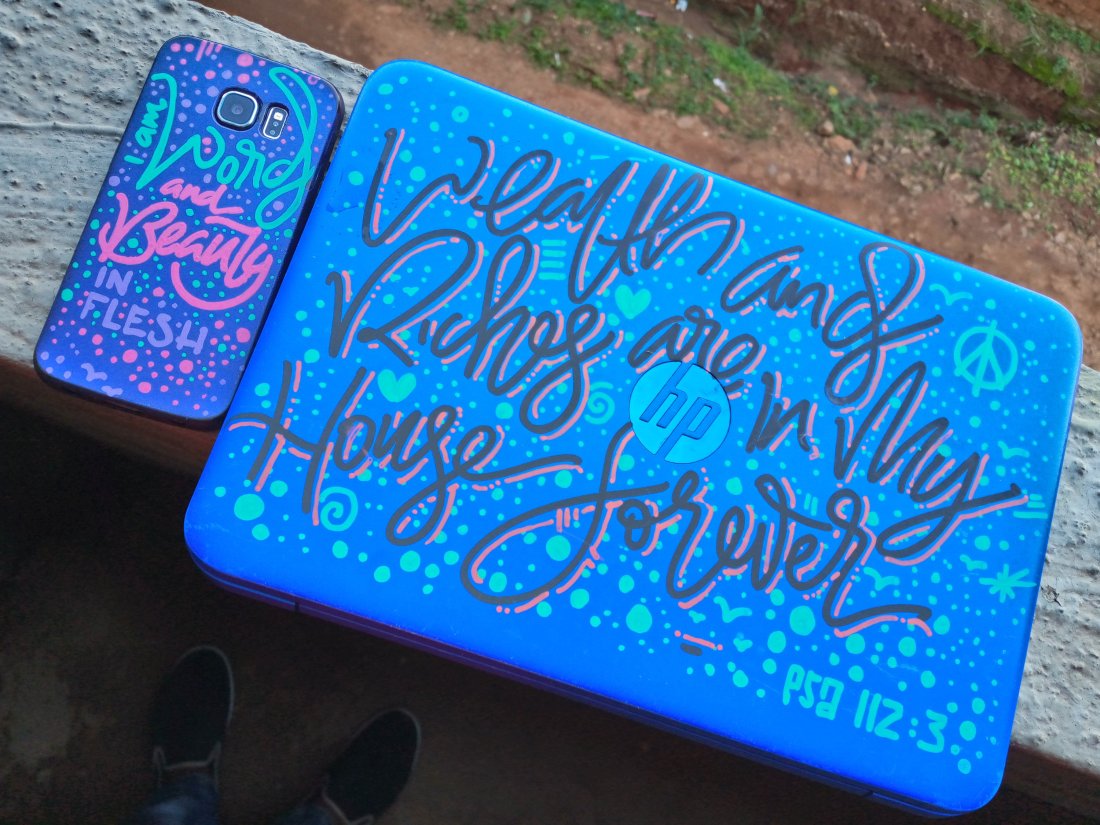 Still following the previous predecessor-branches, laptop surfaces came on board. The biggest challenge was the fading of the acrylic ink off the surfaces. I kept on praying for a solution which arrived in September the very same year. Application of strong nail polish over the words months later that would crack off. I needed a better solution! In January 2020, I discovered a stronger sealing component: Varnish! No word can fade off now!