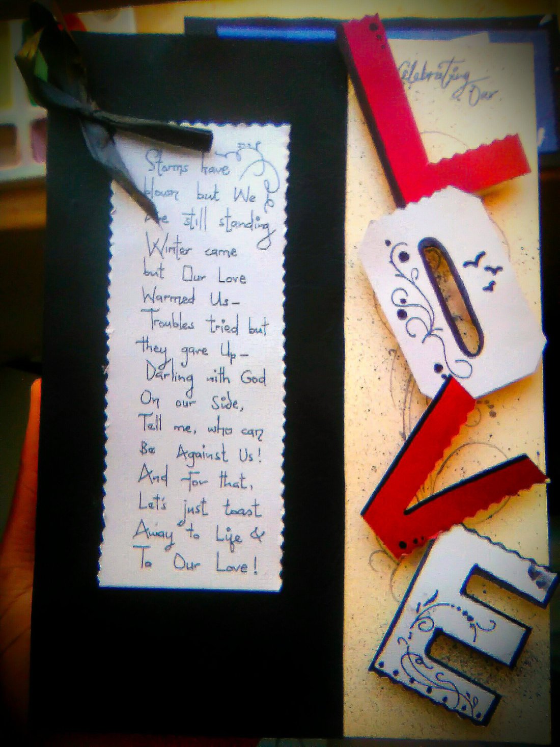 This was a discovery that sparked a new floor. Previously, I had been making plain simple cards since high school. All that was admirable was the deployment of color and calligraphy. Now I had obtained a new technique that was first applied in this Celebrating Love card. The love letters are on a different altitude than the rest of the card. I call such; The Suspendeds.
