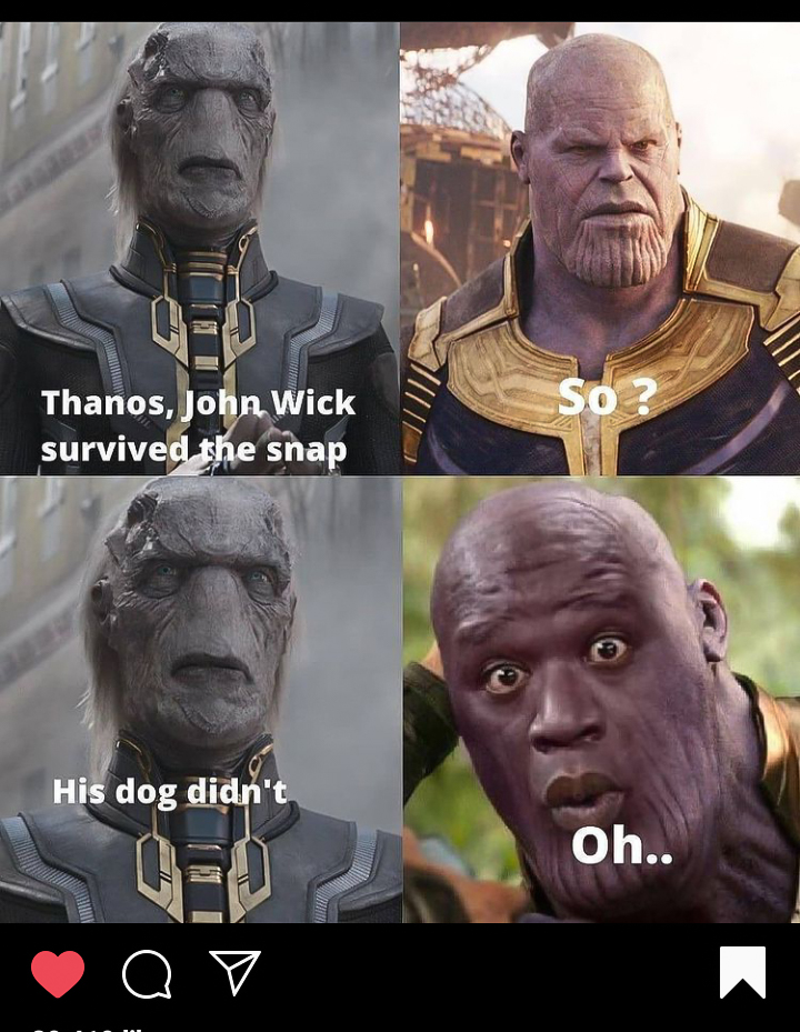 Though wounded, I must say he succeeded in this mission! Thanos, that purple-ish character in the meme is another movie villain who snapped his finger and made 50% of the world’s population vanish. This must have taken John Wick’s dog too. So you can get the drift!