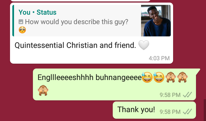 The day I posted that photo on my status, with that question, as shown in the photo attached above, someone described me by that adjective. I studied the word and it brought so much joy to my spirit!