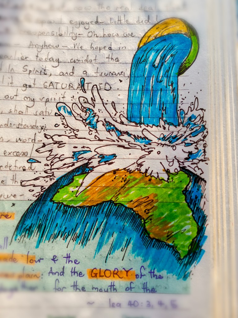 As for me, I am part of His Glory-Knowledge distributing agents. And as I selahed on this Word, He reminded me of the vision He gave me … on September 6th, 2021. I had just read Isaiah 40 verse 5 when this image I saw … and drew. The bowl was being listed by God. The waters pouring out are His glory. And He said “I’ll saturate you, and you’ll saturate the earth, with my music, my books, my understanding, my revelation, my knowledge, my will, my love, my holiness, my greatness, my riches and honor and blessings and wisdom and strength and power and GLORY!”