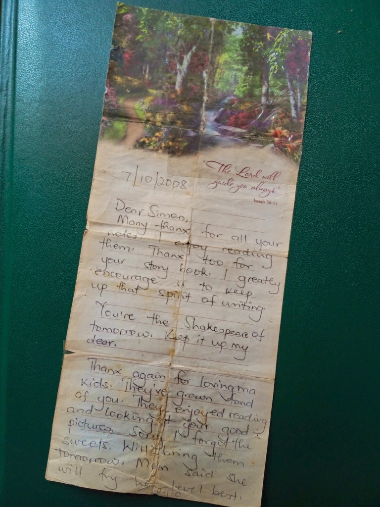 This was a note I received from my English teacher in primary seven. I’d just turned 11. I always rewrote fairy tales, and illustrated them, and she enjoyed reading them especially to her kids.